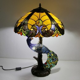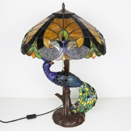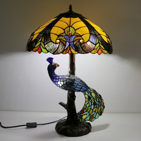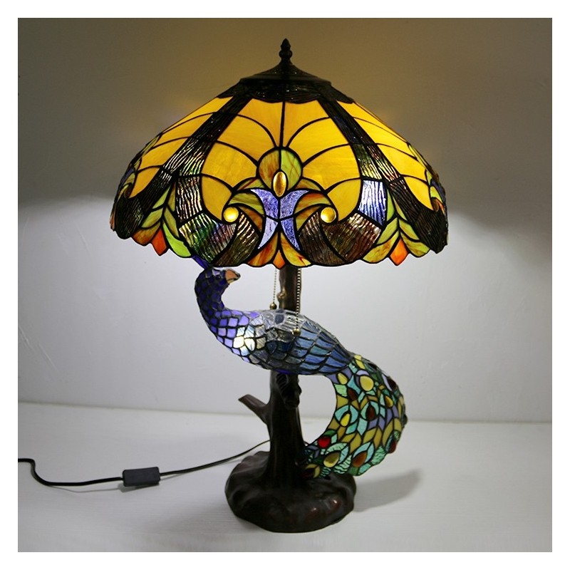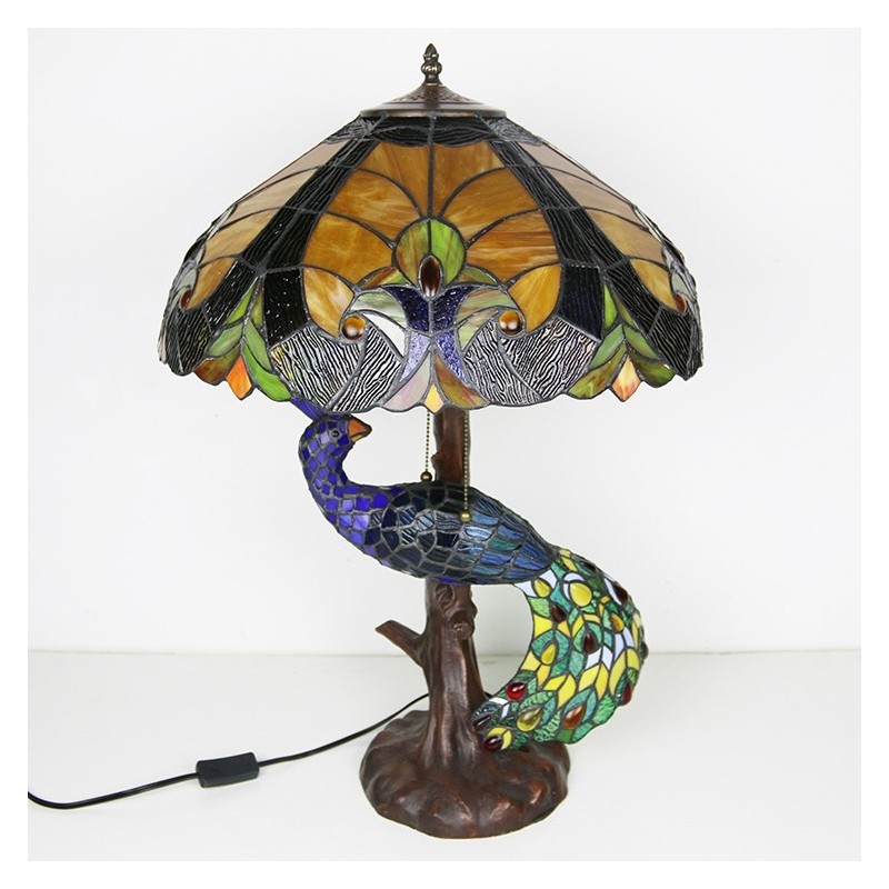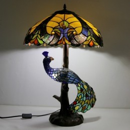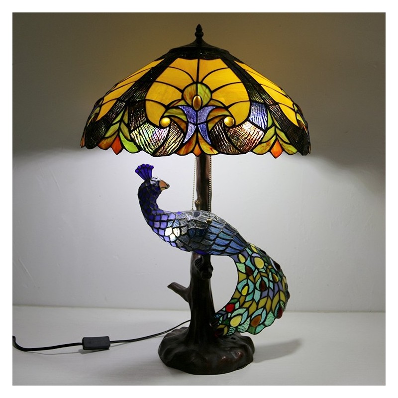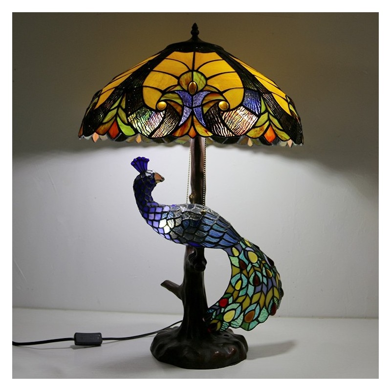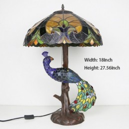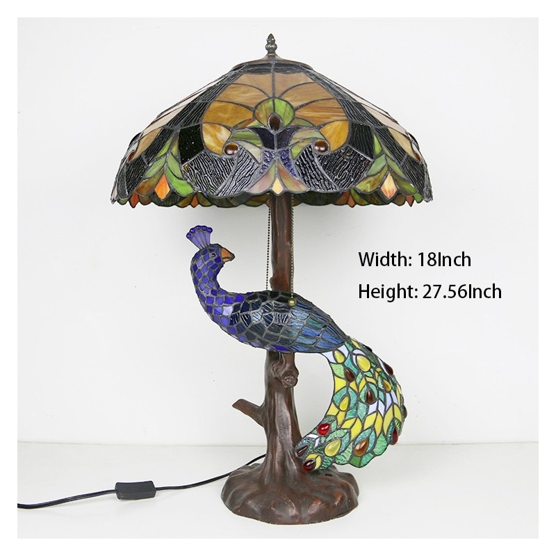 Lámpara de escritorio estilo Tiffany con pantalla de vidrio de colores azul de 18 pulgadas y base de pavo real y árbol de vidrio