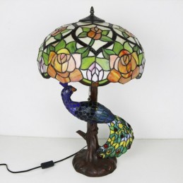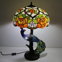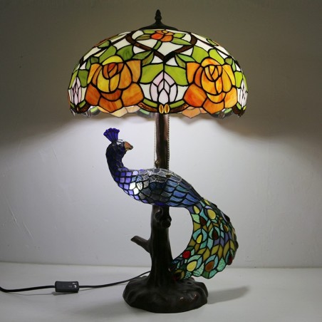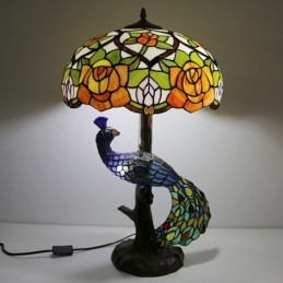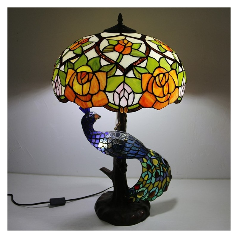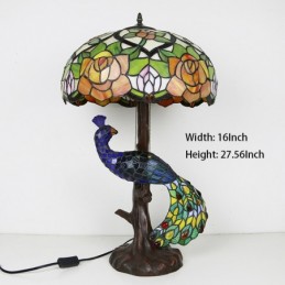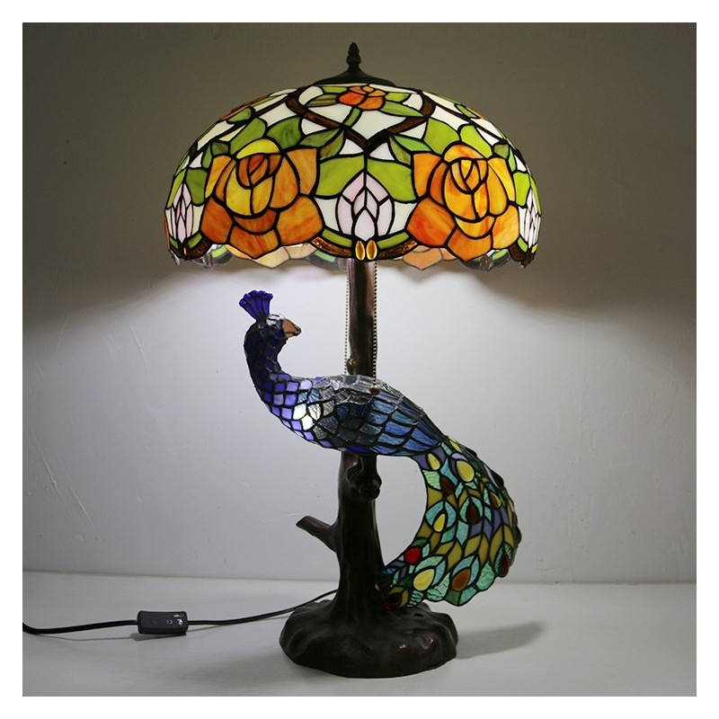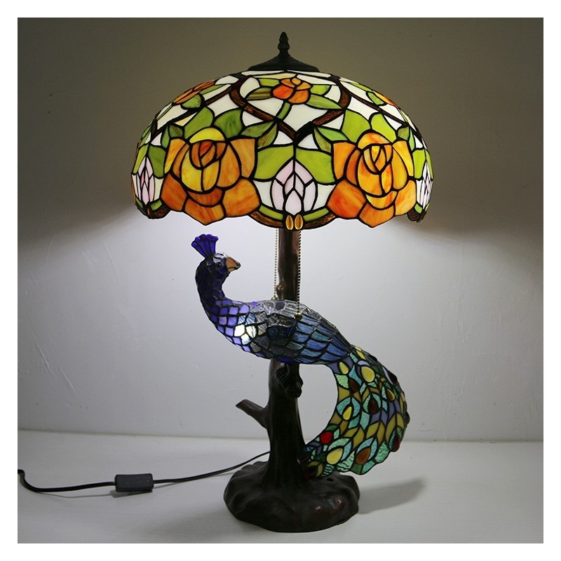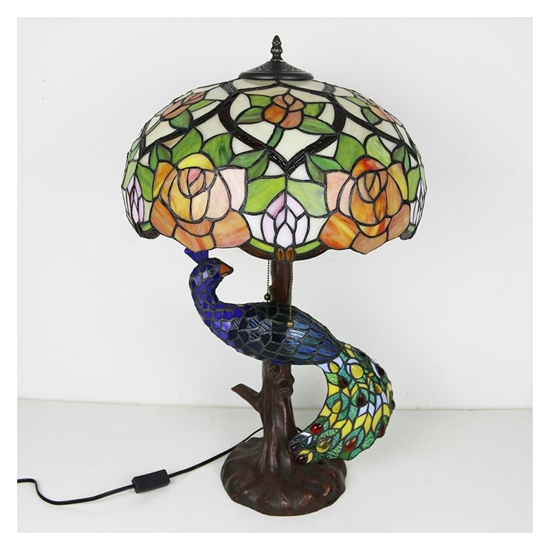 Lámpara de escritorio estilo Tiffany con pantalla de vidrio coloreado en rosa de 16 pulgadas y base de pavo real y árbol de vidrio