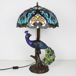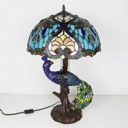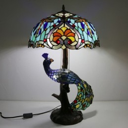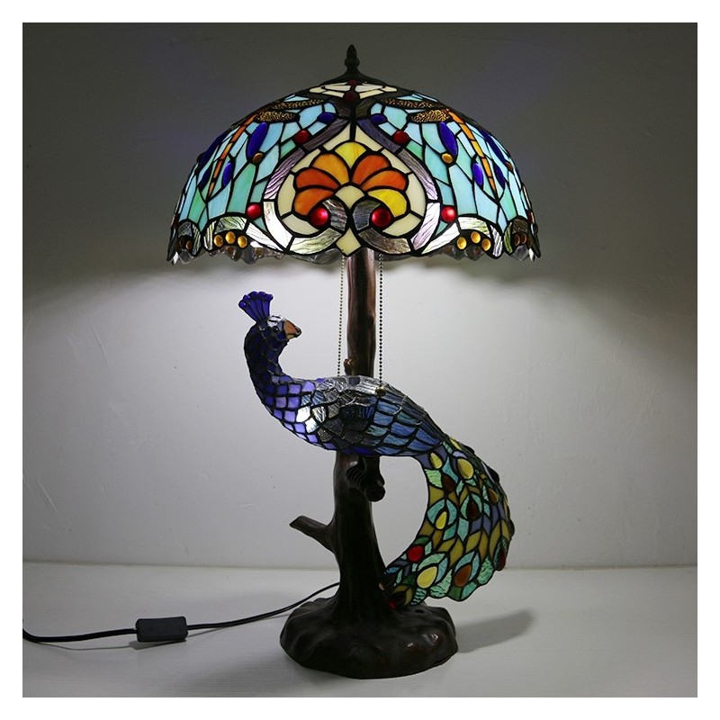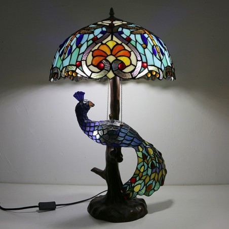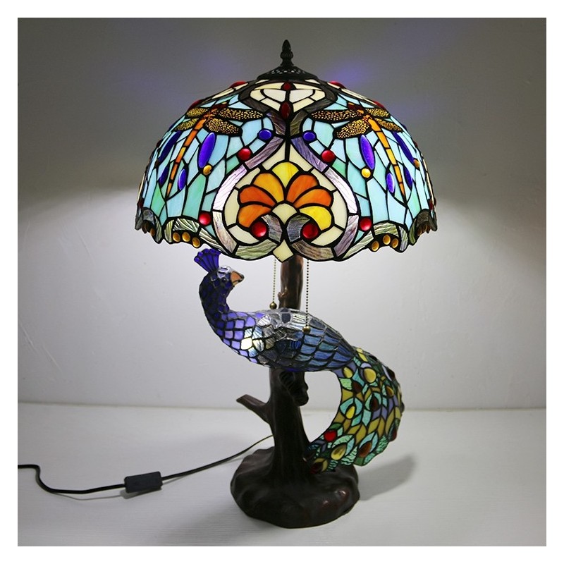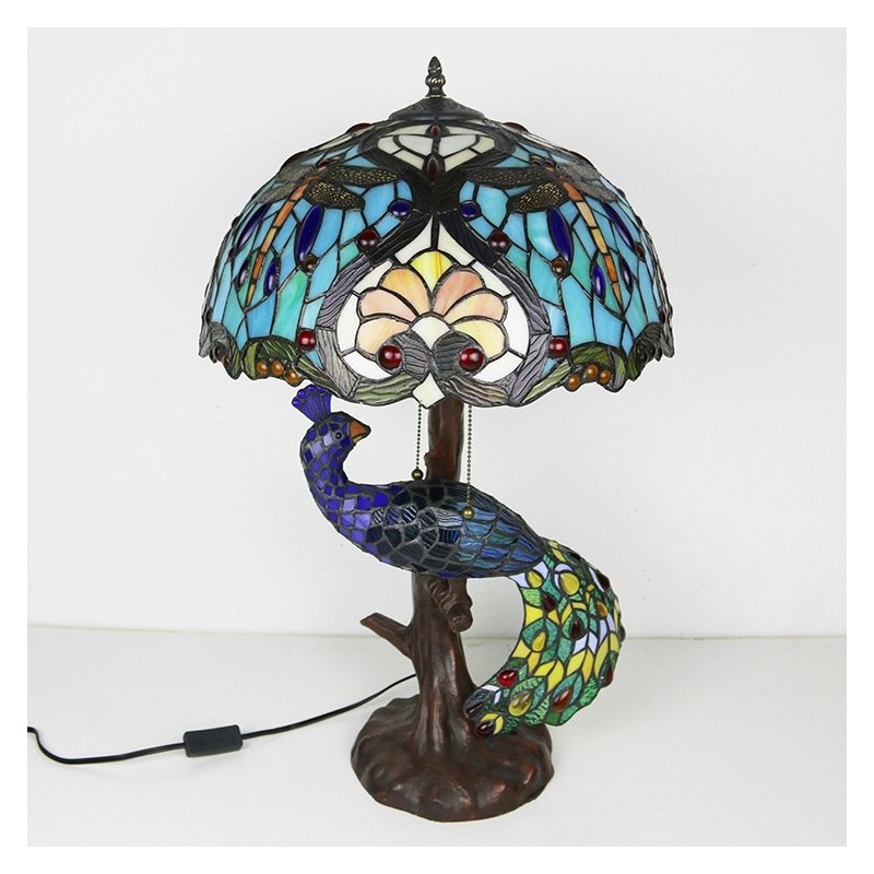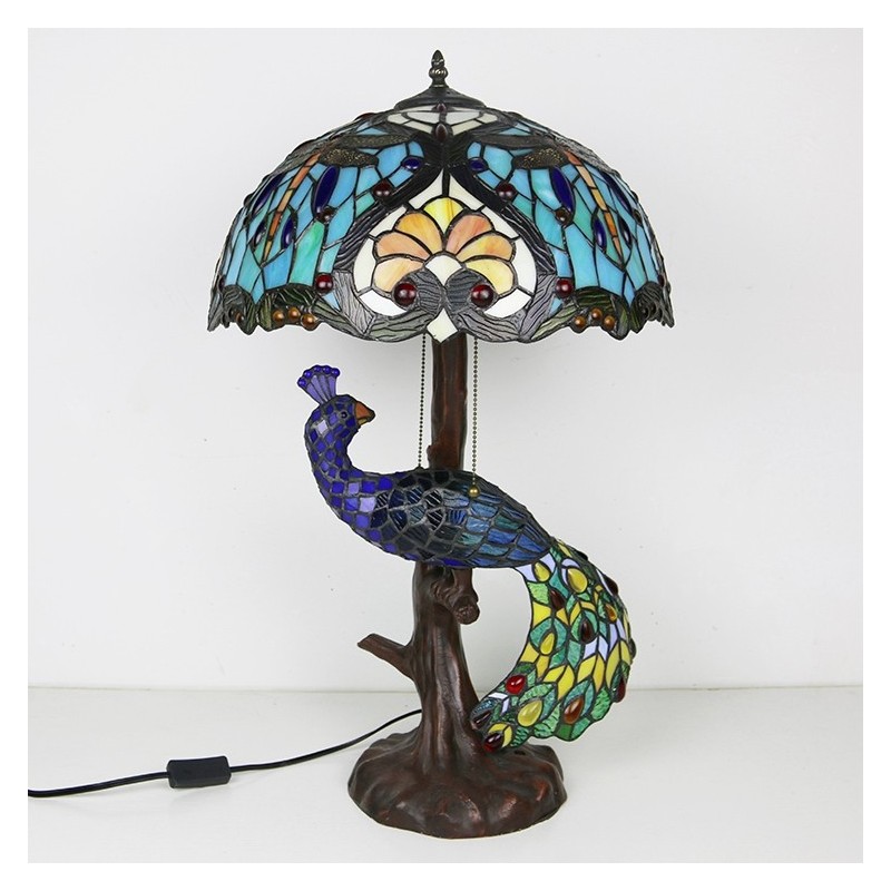 Lámpara de escritorio estilo Tiffany con pantalla de vidrio de colores única de 16 pulgadas con base de pavo real y árbol de vidrio