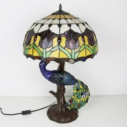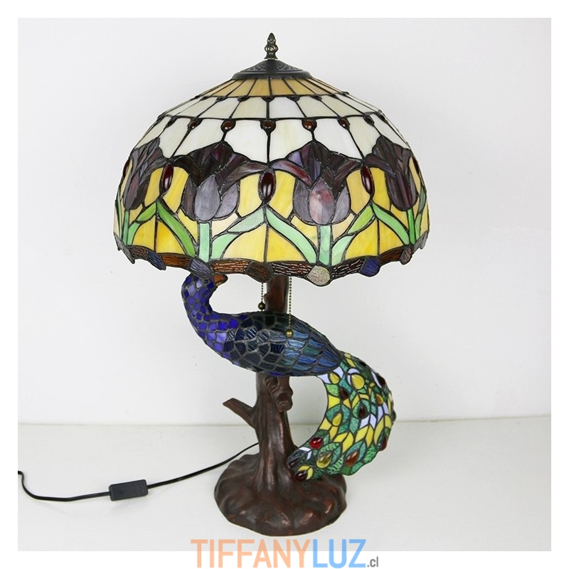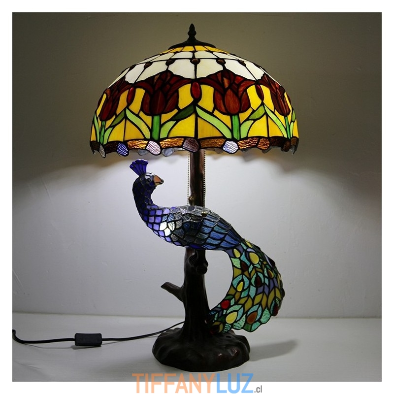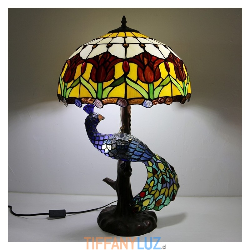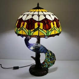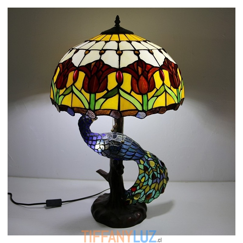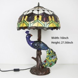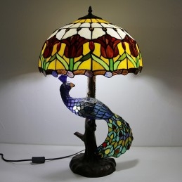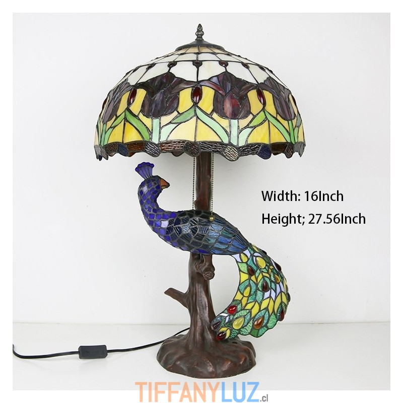 Lámpara de escritorio estilo Tiffany con pantalla de vidrio de colores de tulipán de 16 pulgadas y base de pavo real y árbol de vidrio