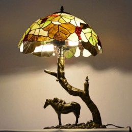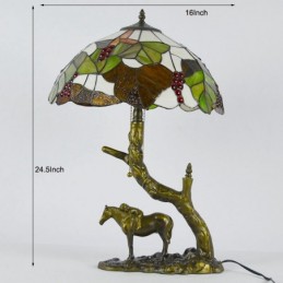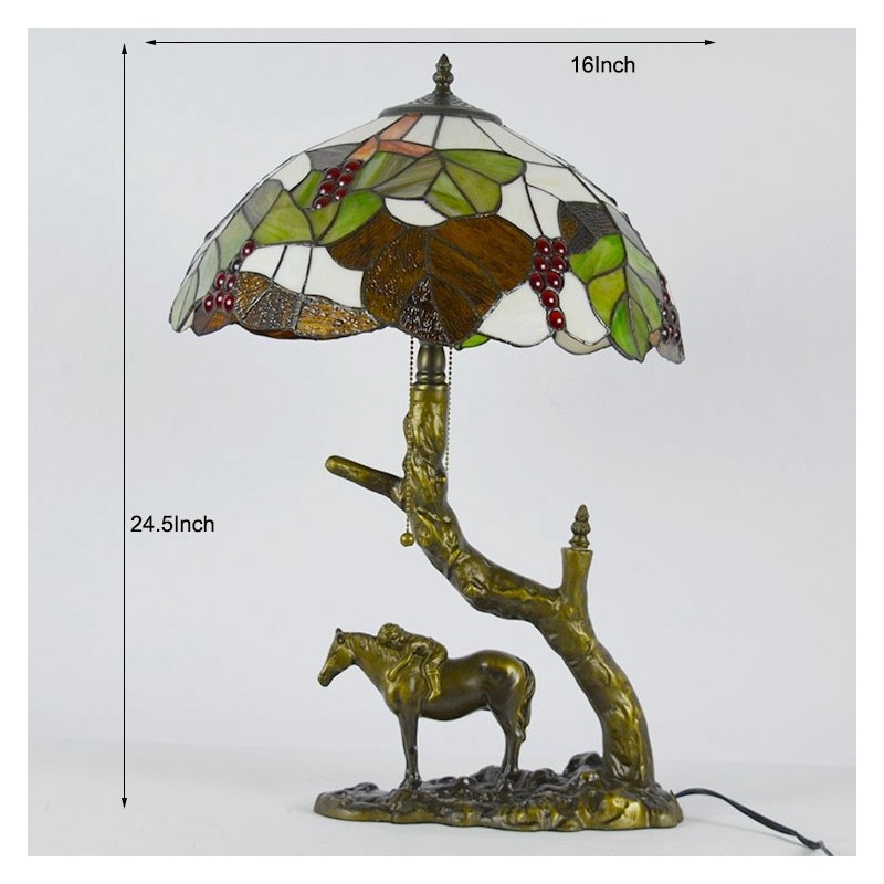 Lámpara de mesa de vidrio de colores estilo Tiffany, lámpara de escritorio con pantalla de hoja de 16 pulgadas y base de resina de caballo
