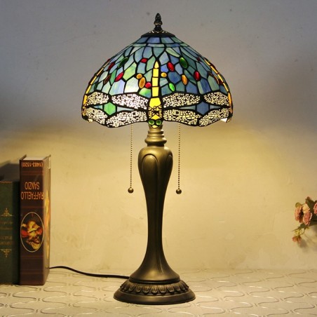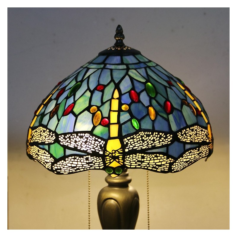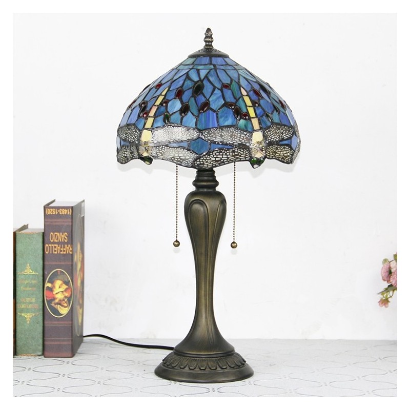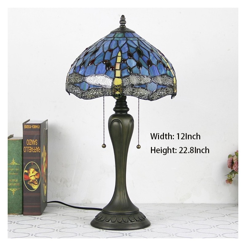 Lámpara de escritorio estilo Tiffany de 12 pulgadas, lámpara de mesa con vitrales en forma de libélula azul, luz creativa para mesita de noche de dormitorio