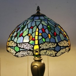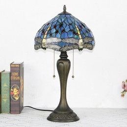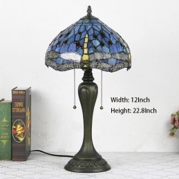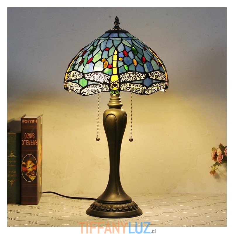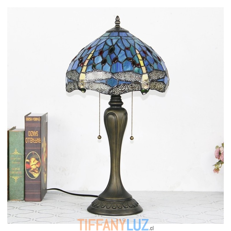 Lámpara de escritorio estilo Tiffany de 12 pulgadas, lámpara de mesa con vitrales en forma de libélula azul, luz creativa para mesita de noche de dormitorio