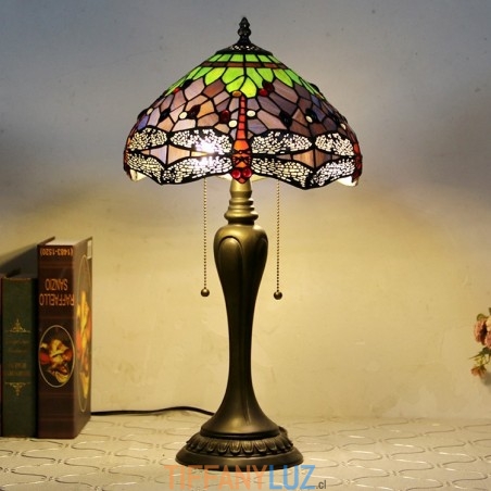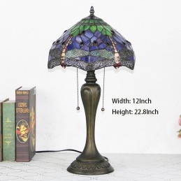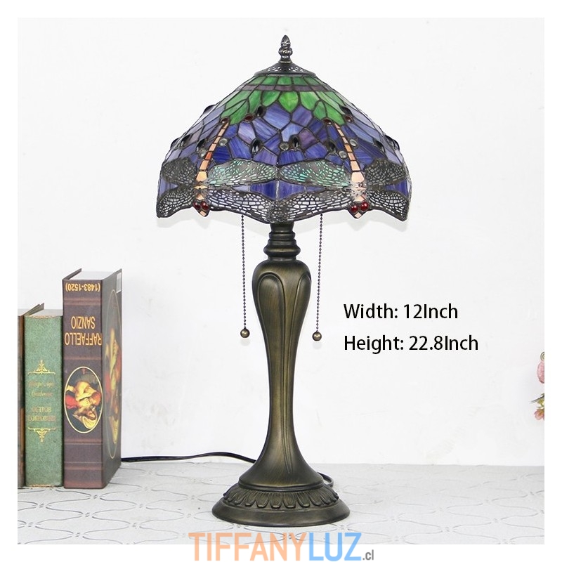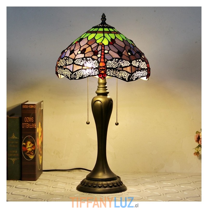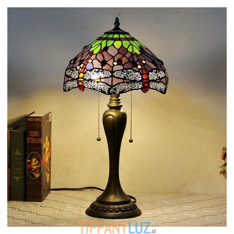 Lámpara de escritorio estilo Tiffany de 12 pulgadas, lámpara de mesa con vitrales en forma de libélula morada, luz creativa para mesita de noche de dormitorio