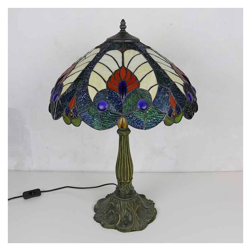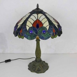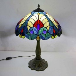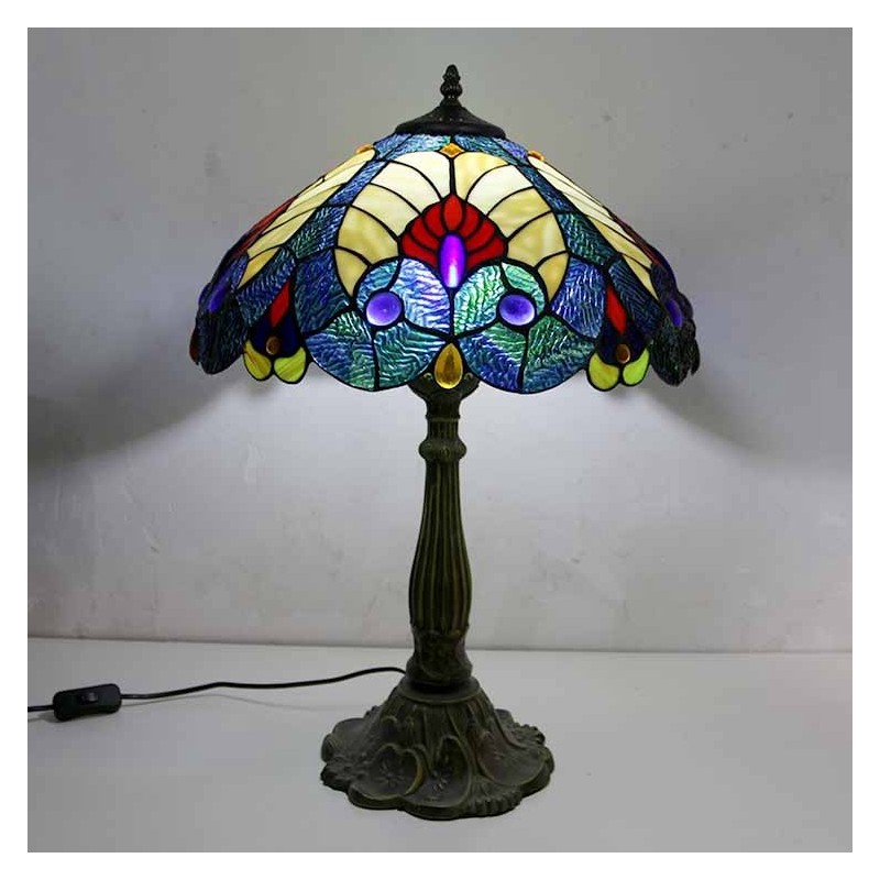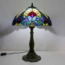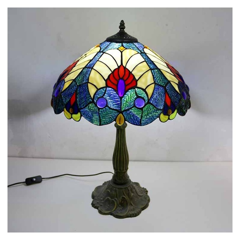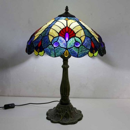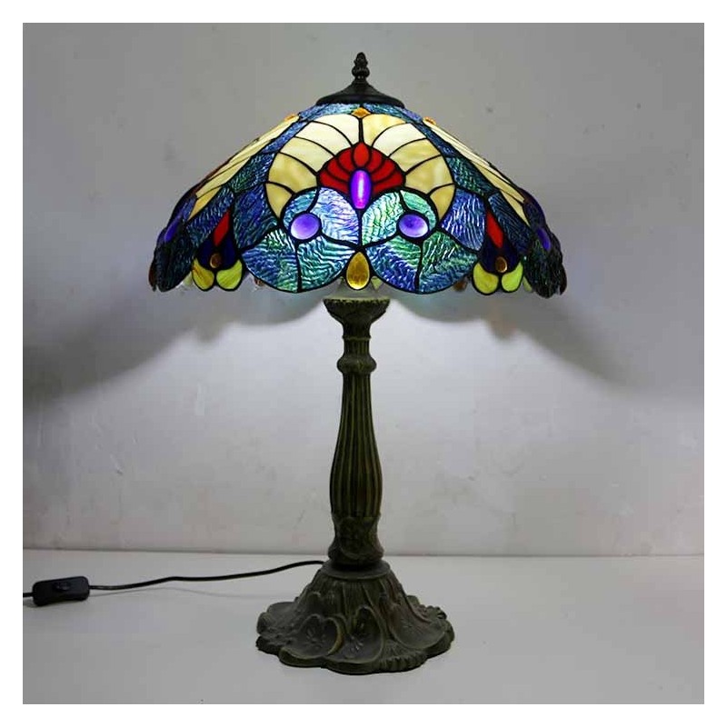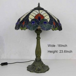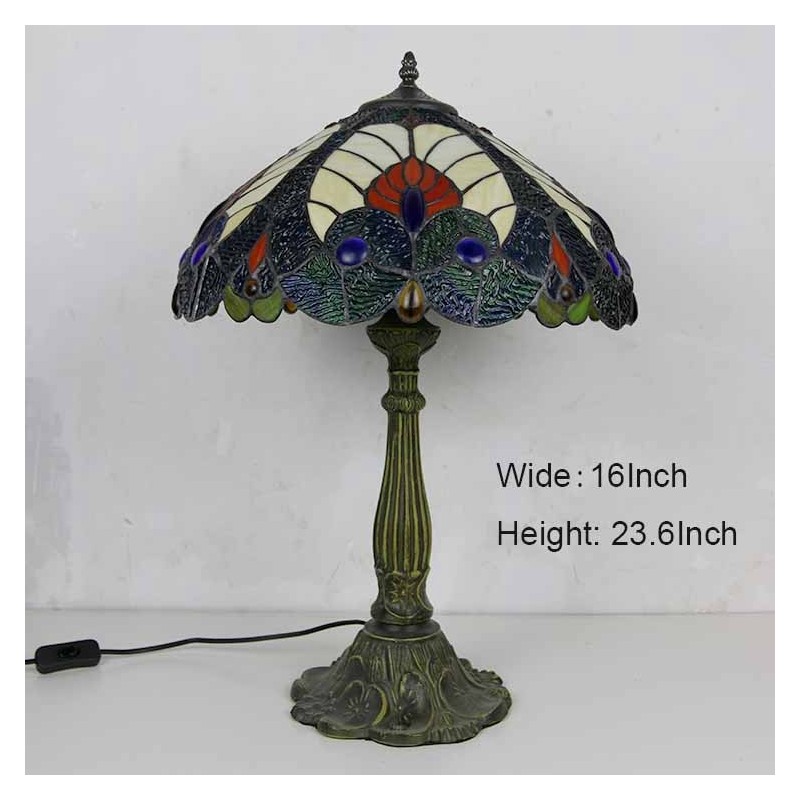 Lámpara de mesa estilo Tiffany con vitral azul real, pantalla de 16 pulgadas de ancho y base de aleación de zinc