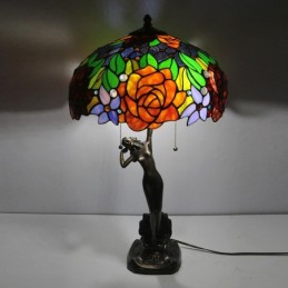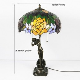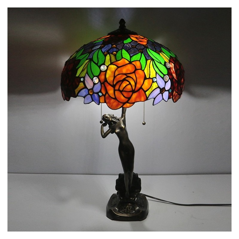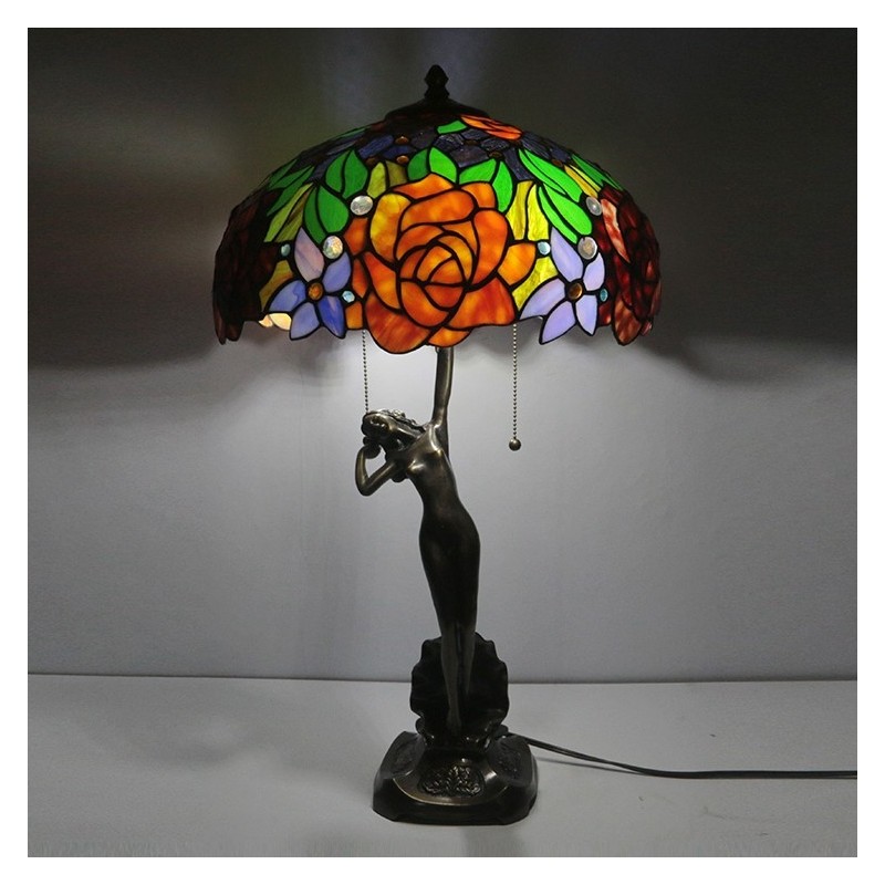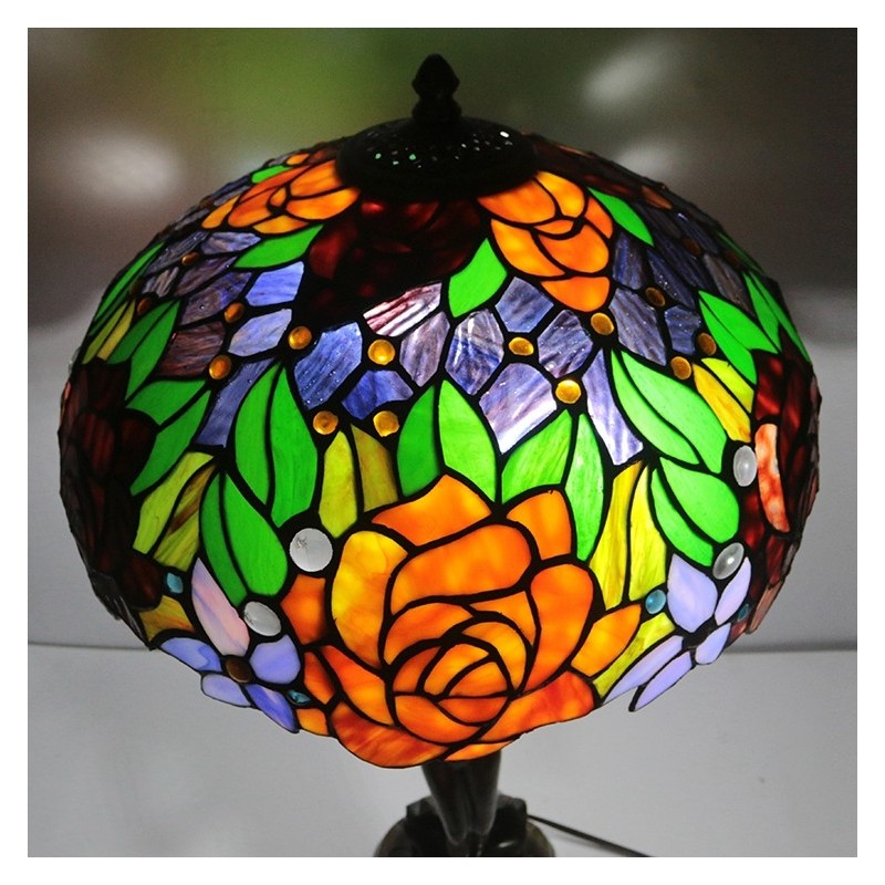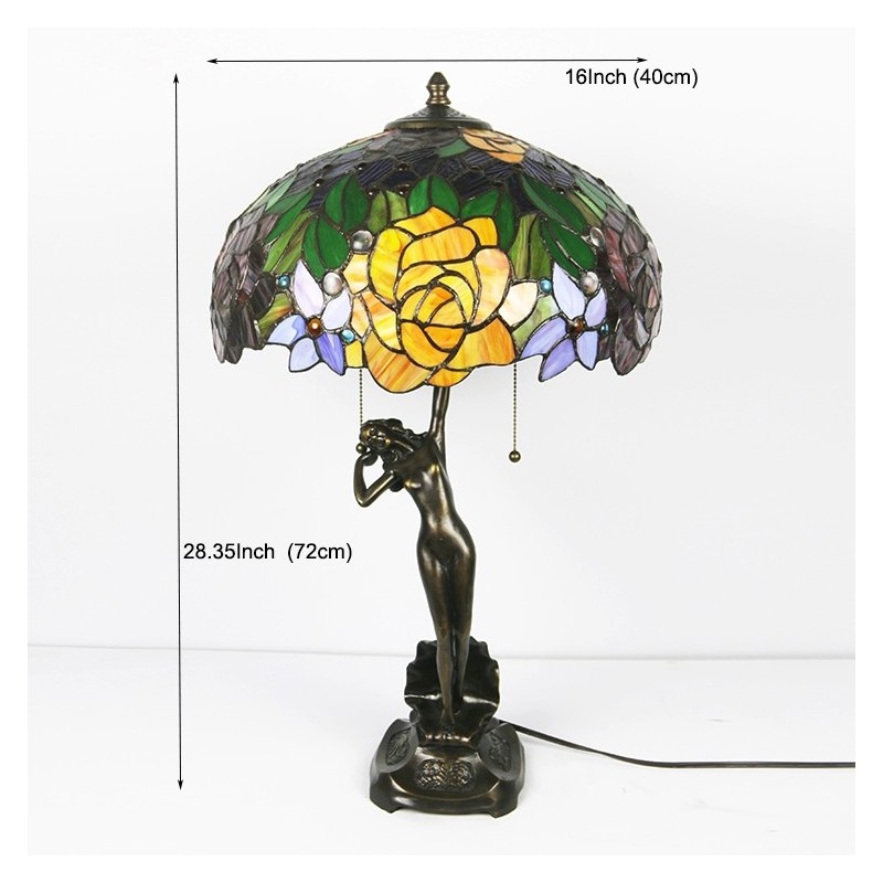 Lámpara de mesa Tiffany de 16 pulgadas con vitrales en rosa, lujosa lámpara de banquero con memoria y base de cobre antiguo