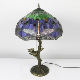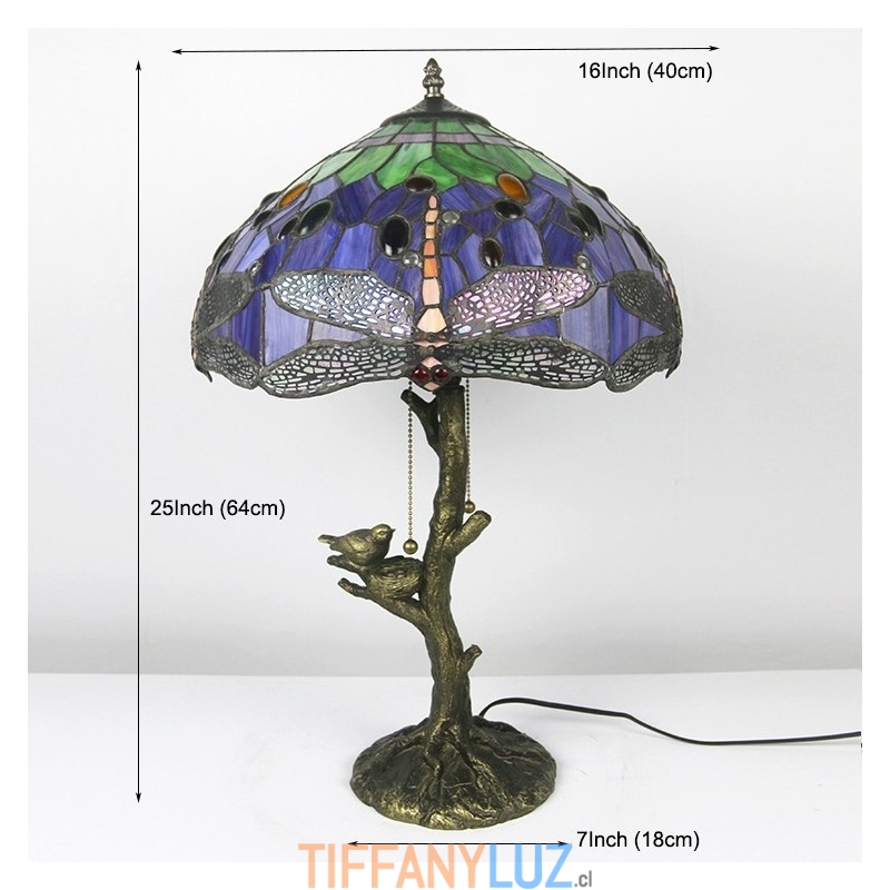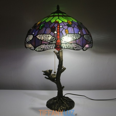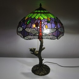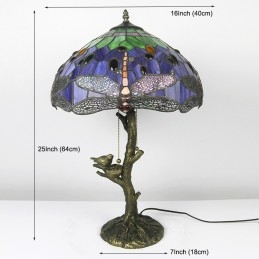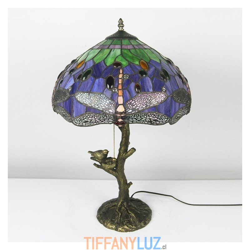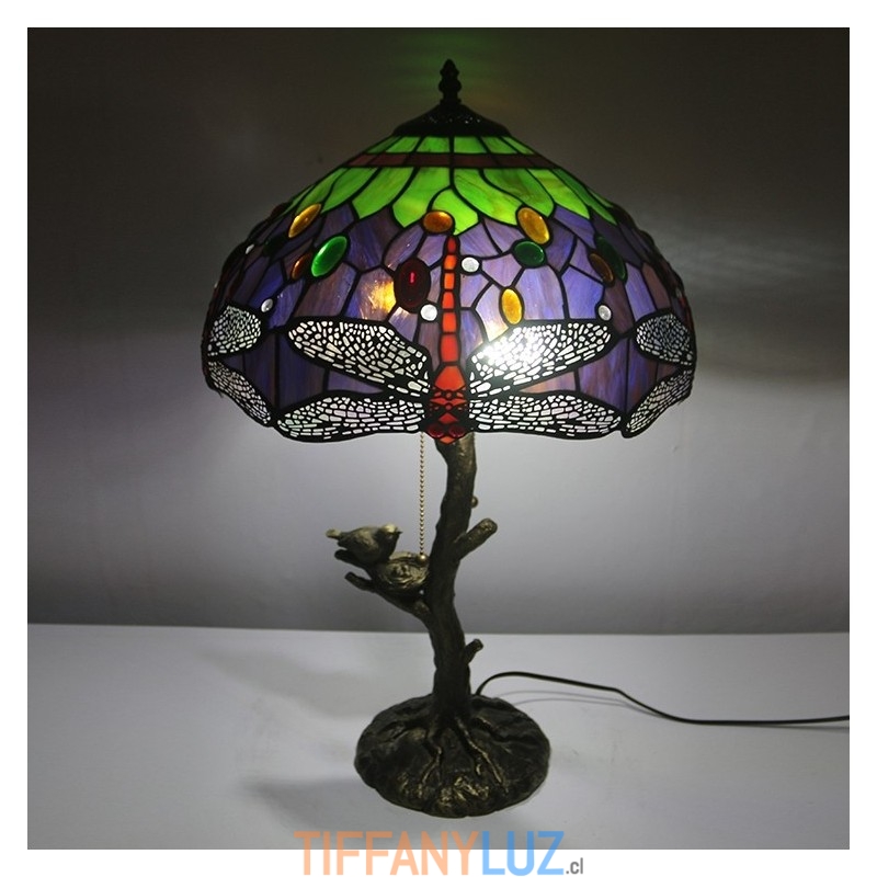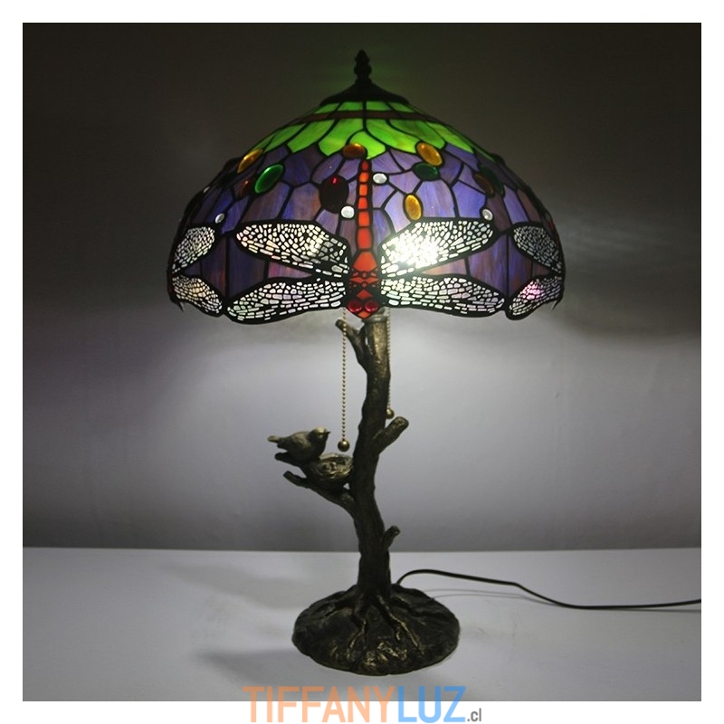 Lámpara de mesa de vidrio de color morado estilo Tiffany con pantalla de 16 pulgadas de ancho y tronco de árbol con forma de nido de pájaro