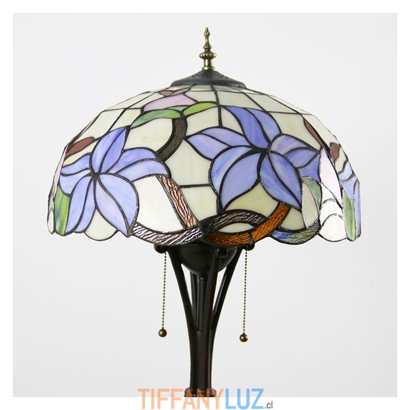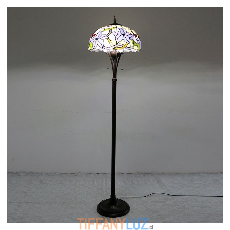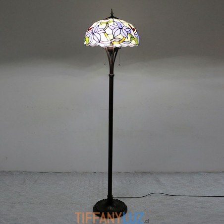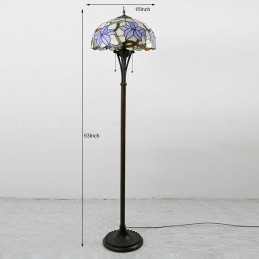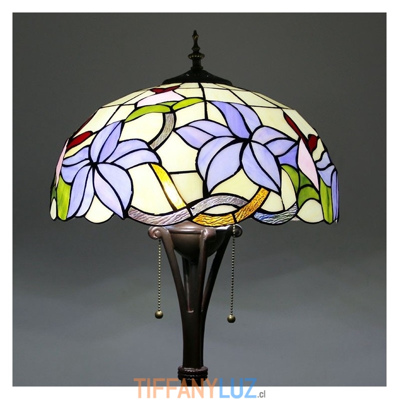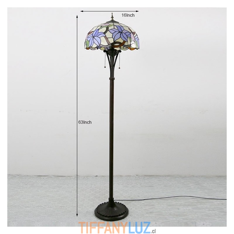 Lámpara de pie de vidrio de color estilo Tiffany con flores moradas y pantalla de 16 pulgadas de ancho hecha a mano