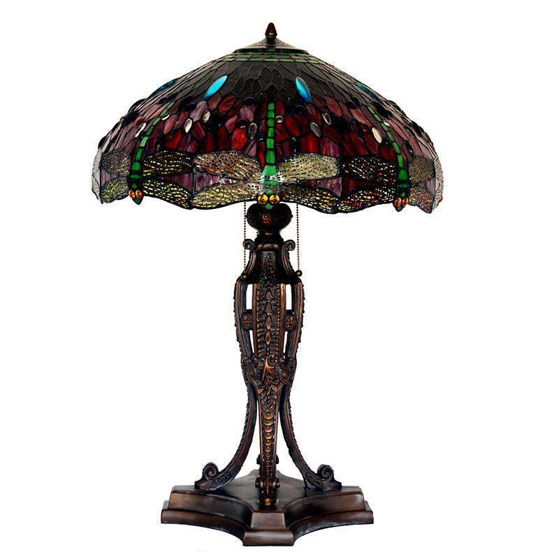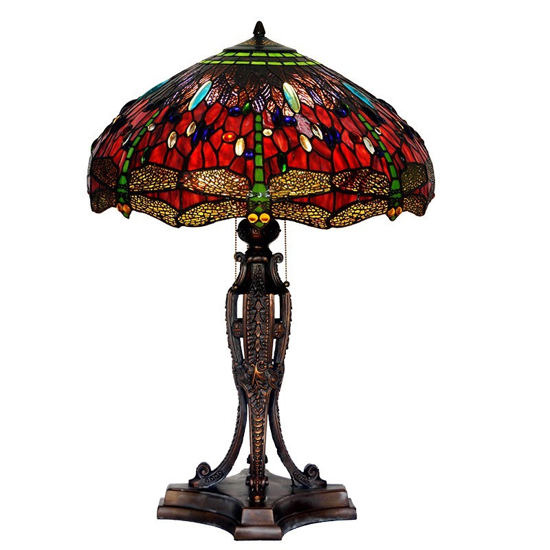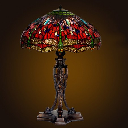 Lámpara de mesa Tiffany de cristal de colores con forma de libélula roja de 55 cm