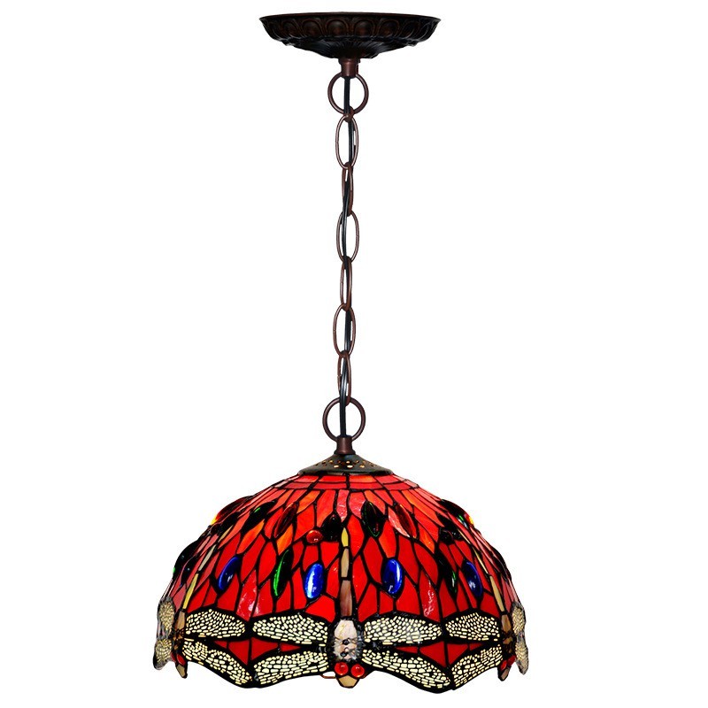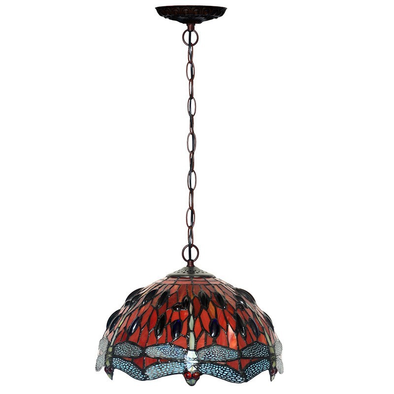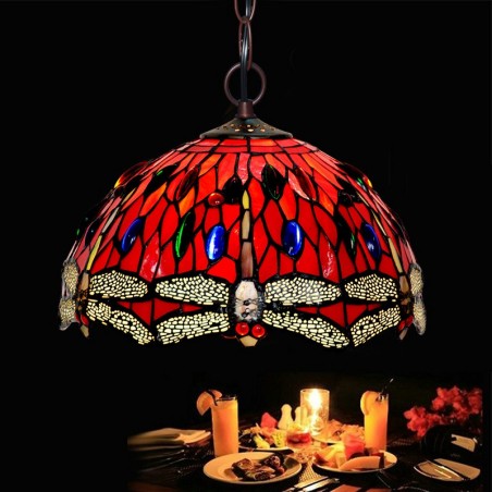 Lámpara colgante de cristal de color Tiffany con forma de libélula roja rural de 30 cm