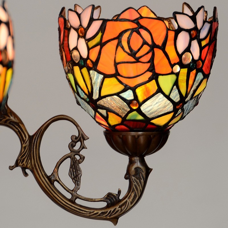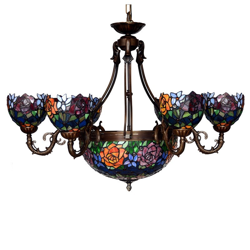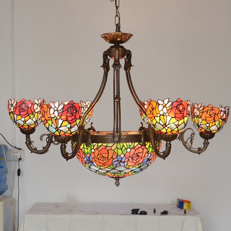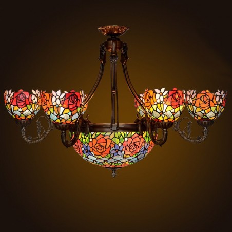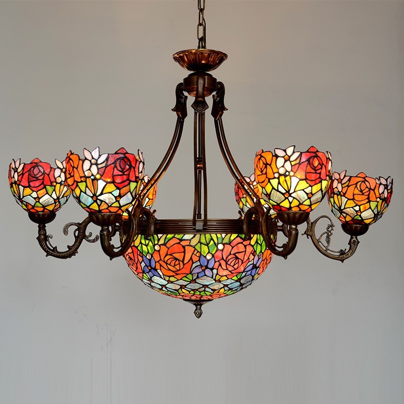 Lámpara de araña de rosas rurales Lámpara de araña de vidrio coloreado Tiffany