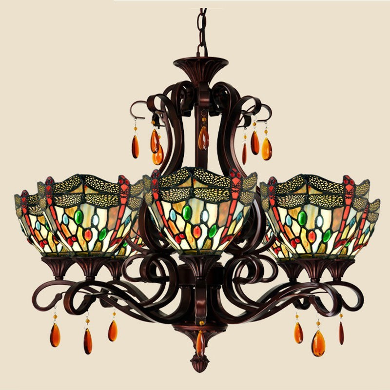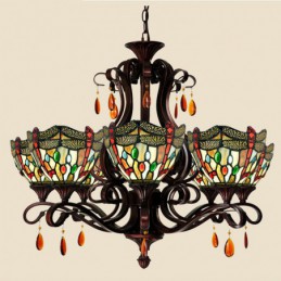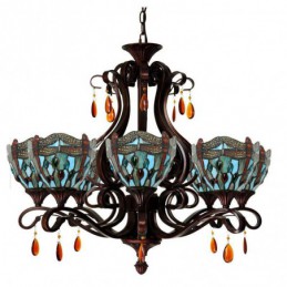 Lámpara de araña de 6 luces con forma de libélula azul y vitrales de Tiffany