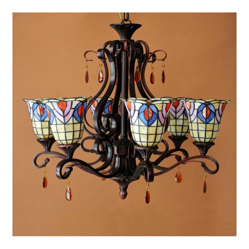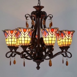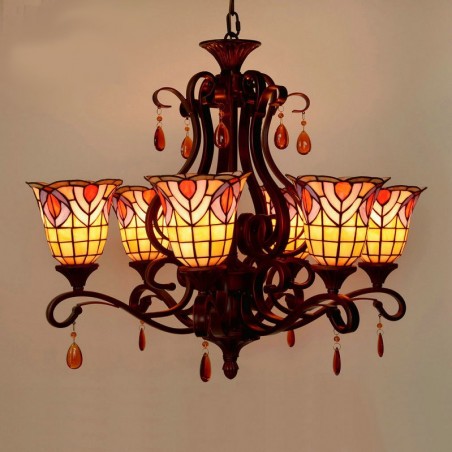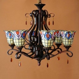 Lámpara de araña retro de 6 luces con vitrales de Tiffany